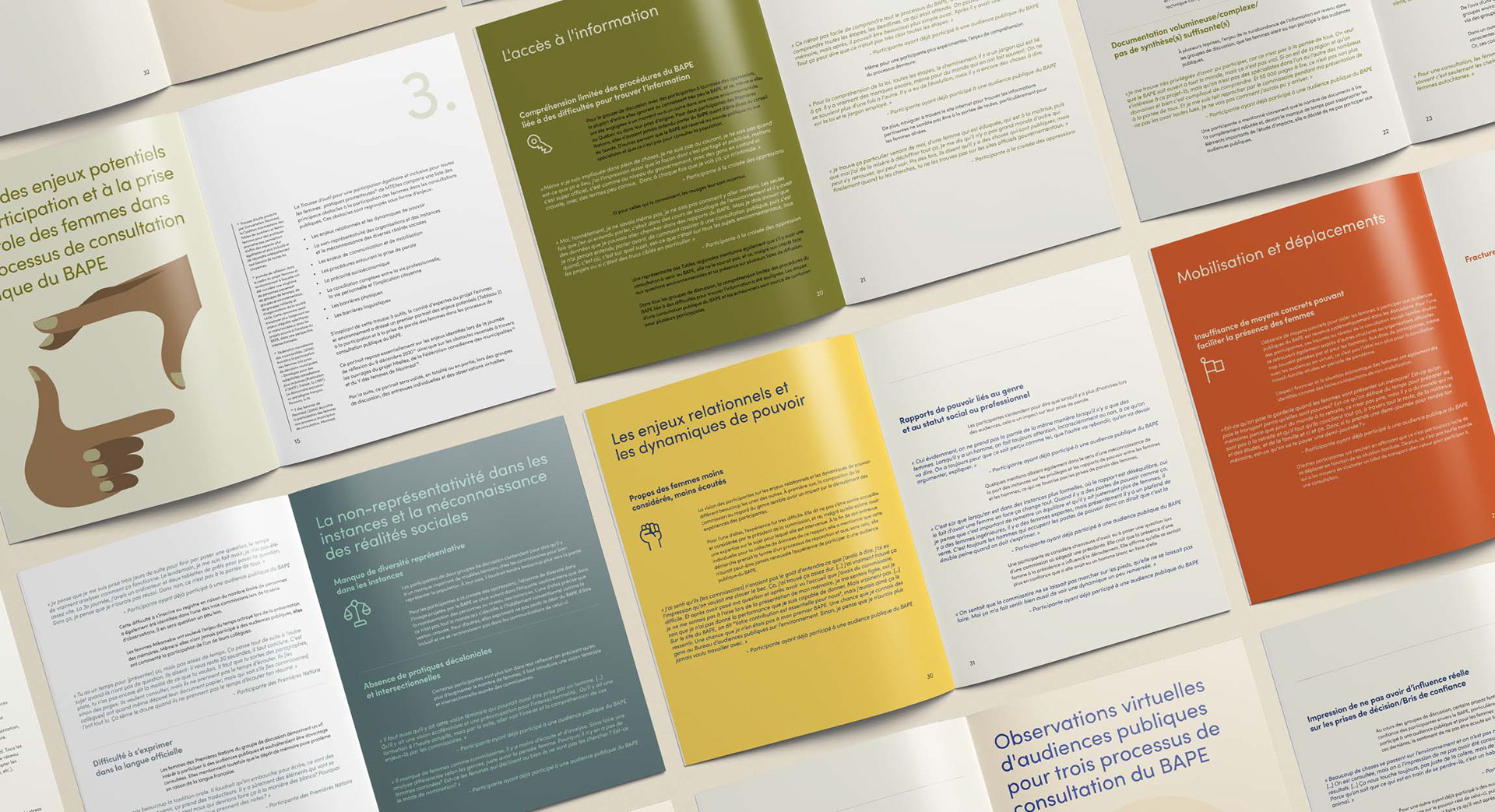 Le RTRGFQ est un réseau issu de la volonté des Tables régionales de groupes de femmes d'agir en concertation. Il permet l'échange d'expertises et d'analyses féministes, favorise les prises de position politique et soutient l'action collective de ses membres en faveur de l'égalité pour toutes les femmes. Le présent rapport émet l'analyse et les recommendations afin de favoriser le rôle des femmes dans les processus de consultation publique du BAPE. L'illustration créée en couverture reprend les formes du logo, dans un hommage au style illustratif inclusif de Goeff McFetridge.